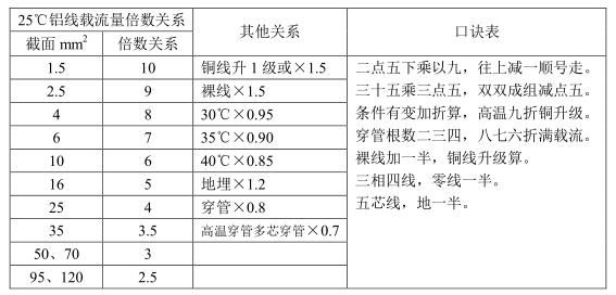 口訣:十下五,百上二,二五三五四三界,七零九五兩倍半,溫度八九折,銅材升級算。