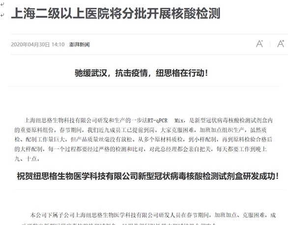 我司戰略合作伙伴紐思格生物充分發揮企業的優勢積極響應人民需求在疫情爆發初期就不計成本不計付出投入各種酶、Master Mix和核酸提取試劑的生產研發,經過全體員工夜以繼日的努力,紐思格于27日宣布新型冠狀病毒核酸檢測試劑盒研發成功,為抗擊疫情奉獻綿薄之力。