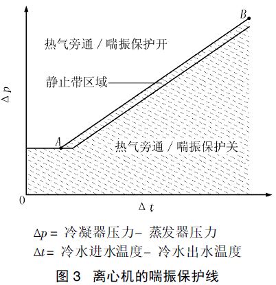 機組通過本機集總控制裝置(PIC)監測壓縮機電機的電流來判斷機組是否進入喘振工況。一旦機組電流的波動幅度超過一定值(默認是25%,也可以通過控制面板LID設定)達1s,控制系統就會記下一次喘振。如果在設定時間段內( 默認是5 min) 這樣的波動達到12次,控制系統就認為機組運行進入了喘振工況, 機組就會停止運行并報警(EXCESSIV E COMPR SU RGE)。這樣就對機組進行了保護,防止喘振對機組的損壞。此外,還可以通過可選配件-熱氣旁通閥,當機組將要進入喘振工況時打開熱氣旁通閥來改善機組的工況,達到對機組的喘振保護。